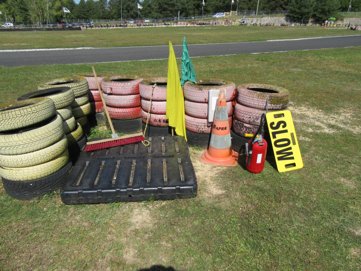Un drapeau jaune par commissaire, un drapeau vert. Un talkie-walkie (1), une corde tire kart, une pancarte « SLOW », un balai, un extincteur.